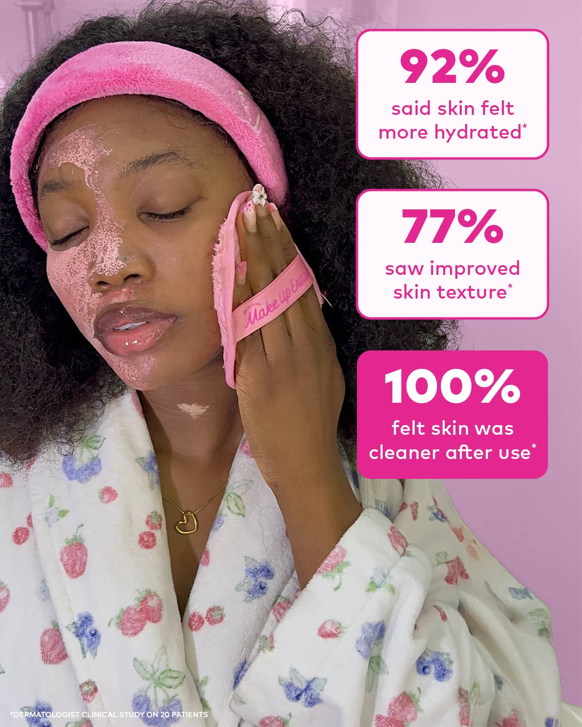 Crafted with millions of cloud-soft fibers, this reusable, machine-washable cloth is 2.5x more effective than traditional makeup wipes & safe for all skin types, including sensitive skin & lash extensions. One side removes makeup, while the other gently exfoliates.