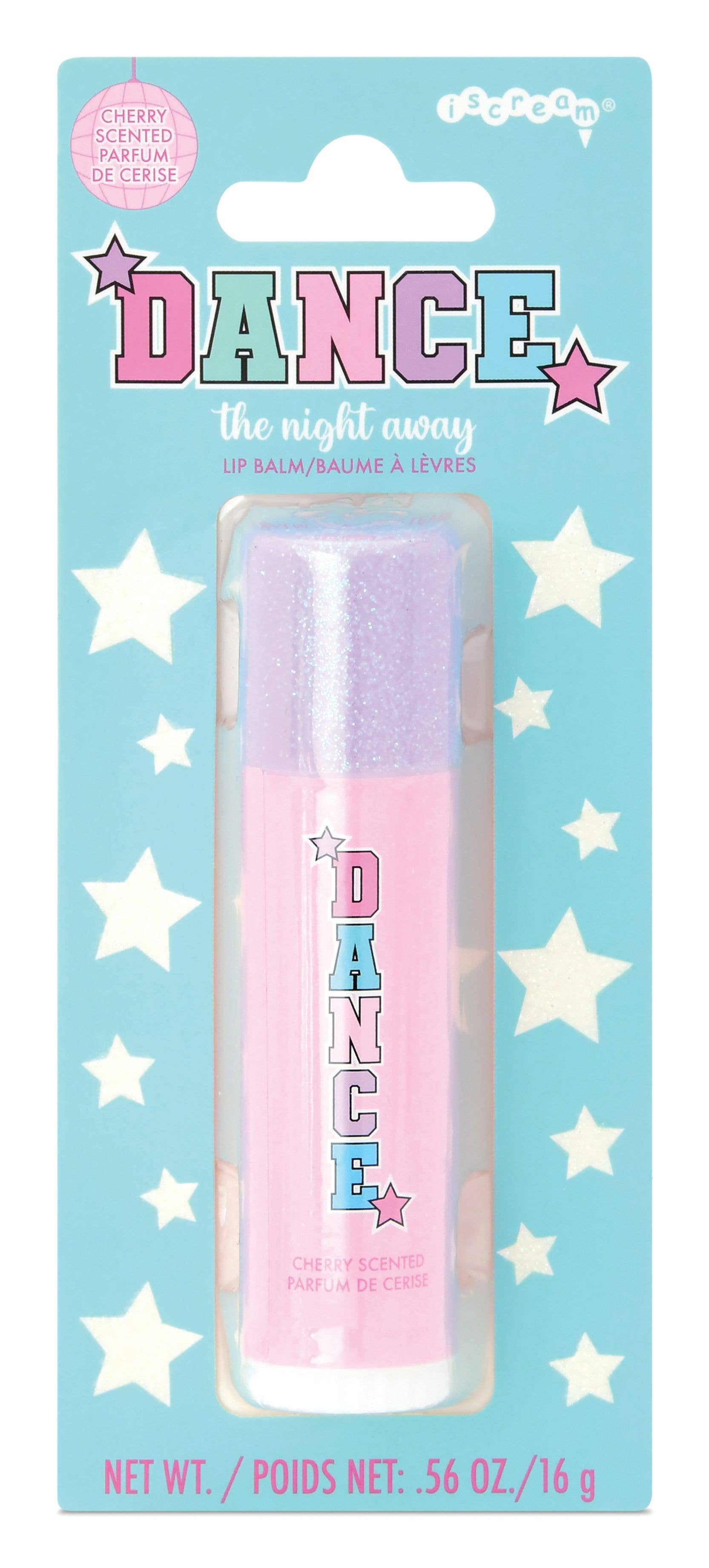 Dance themed lip balm Cherry flavored 0.56 oz. Packaged in a peggable blister card 2 1/4" w x 5 1/2" h.